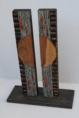 The "WOODSAIC" series blends woodworking with mosaic material inlays. Some pieces can be displayed on a table or surface while others are mounted on the wall.